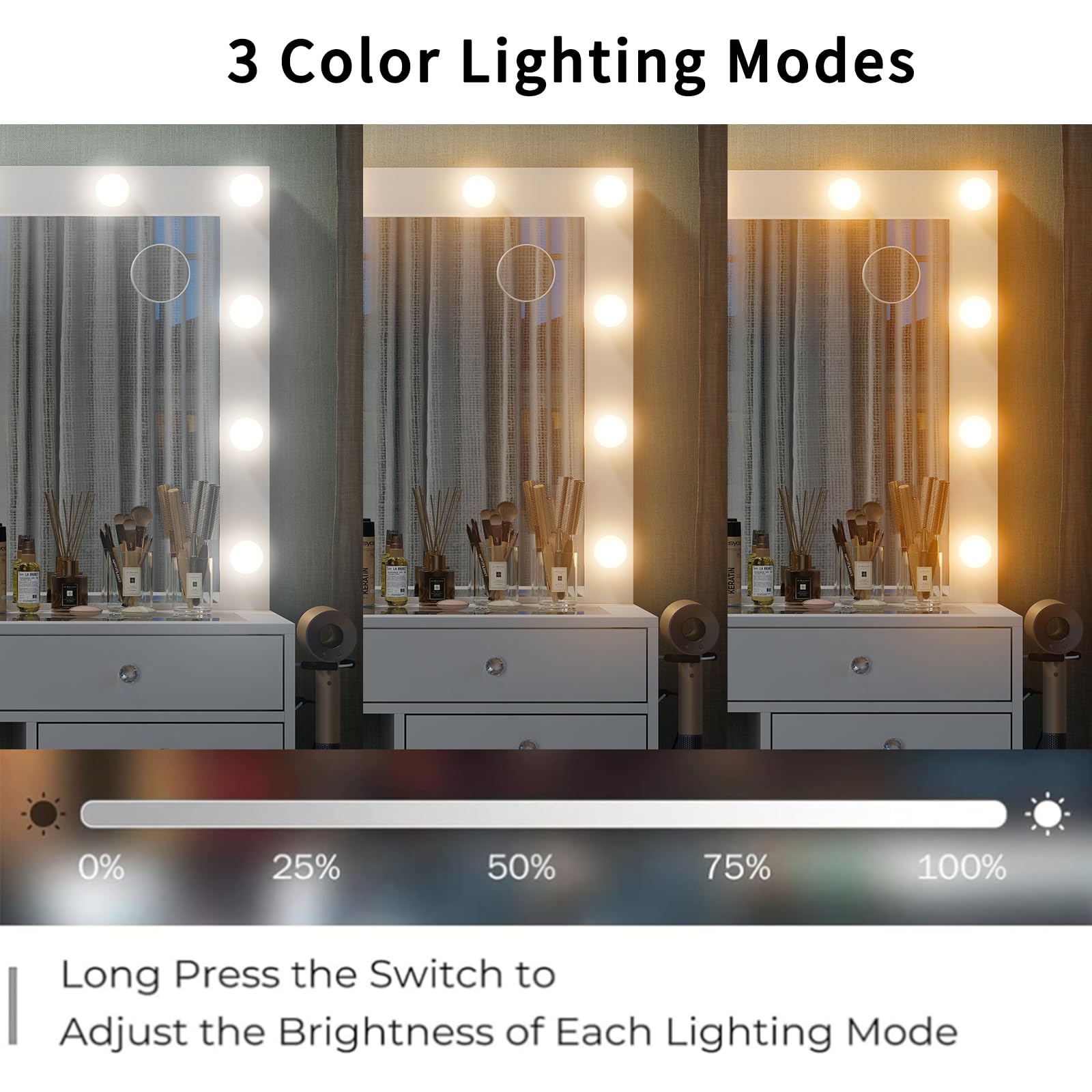 - 3 Brilliant Lighting Options: Equipped with an HD mirror and 13 LED Hollywood-style bulbs, this vanity desk provides 3 color modes (warm, natural, and cool) with adjustable brightness to suit all your makeup needs. Whether you're applying makeup at home, running a salon, or live streaming, this vanity ensures you look flawless under star-quality lighting