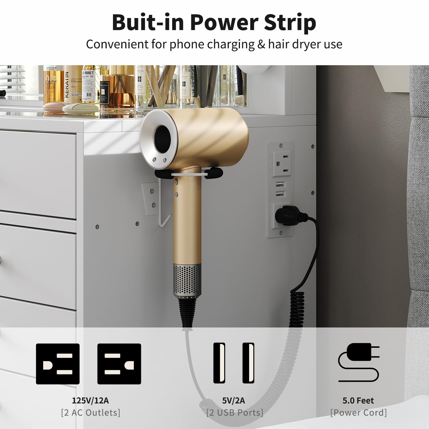 - Vanity Table with Charging Station: Stay connected and powered up with the power outlet, featuring 2 standard plug sockets and 2 USB ports. Perfect for charging your hair dryer, curling iron, phone, tablet, or laptop, this vanity table lets you take stunning selfies or stay productive while you glam up