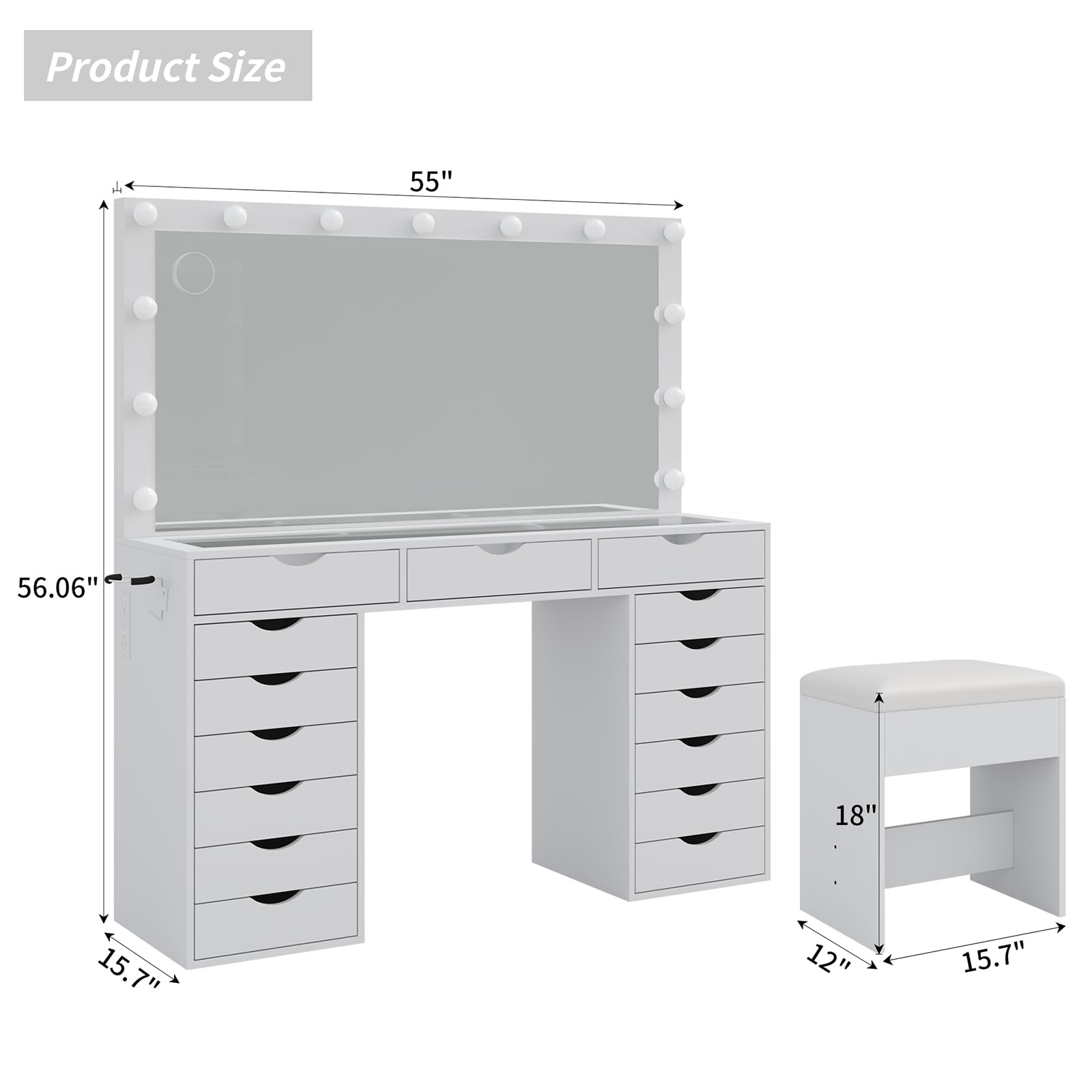 Yanosaku Vanity Desk with Mirror and Lights, Makeup Table with Charging Station, 3 Color Lighting Modes, 15 Drawers Dressing Table, Vanity with Chair for Bedroom, White