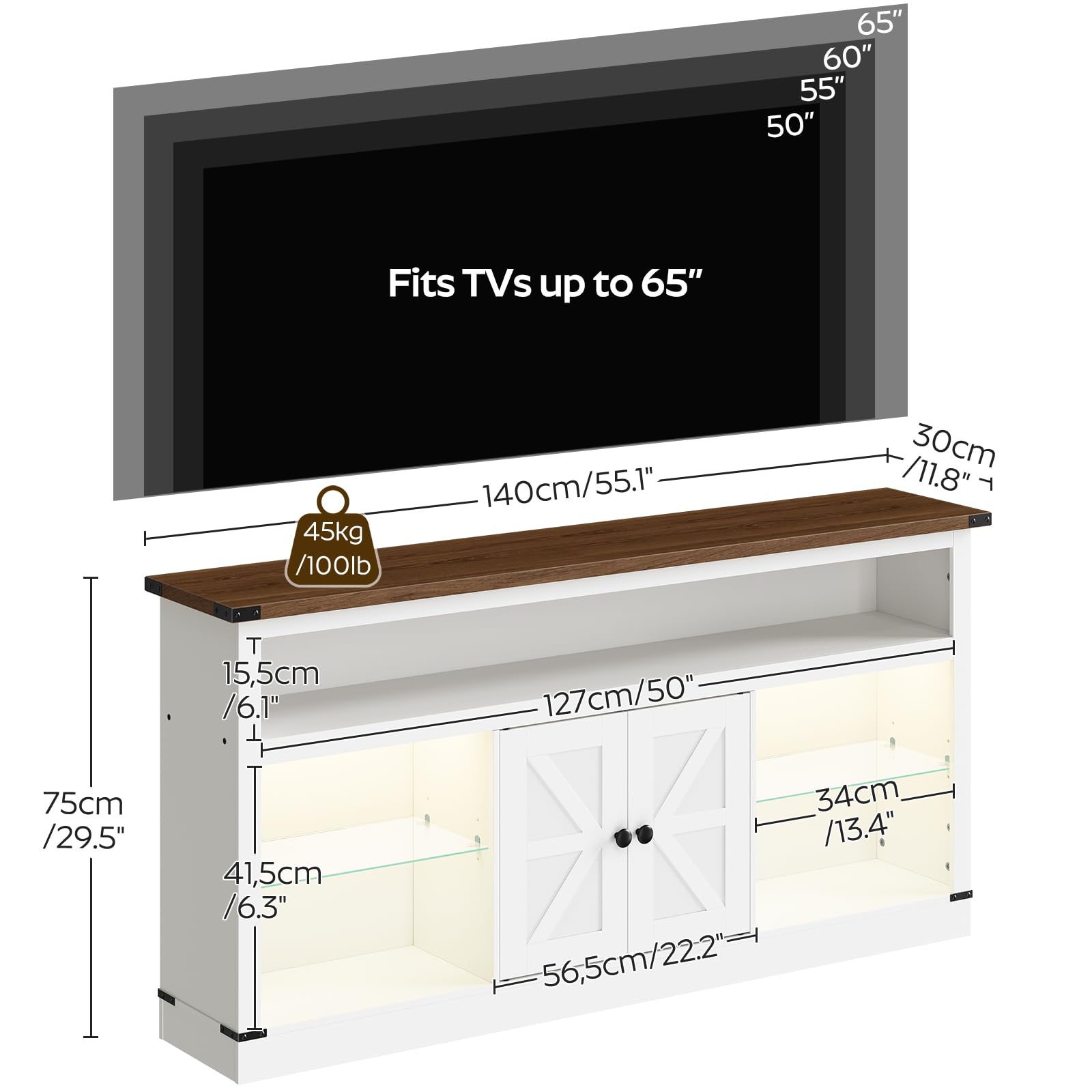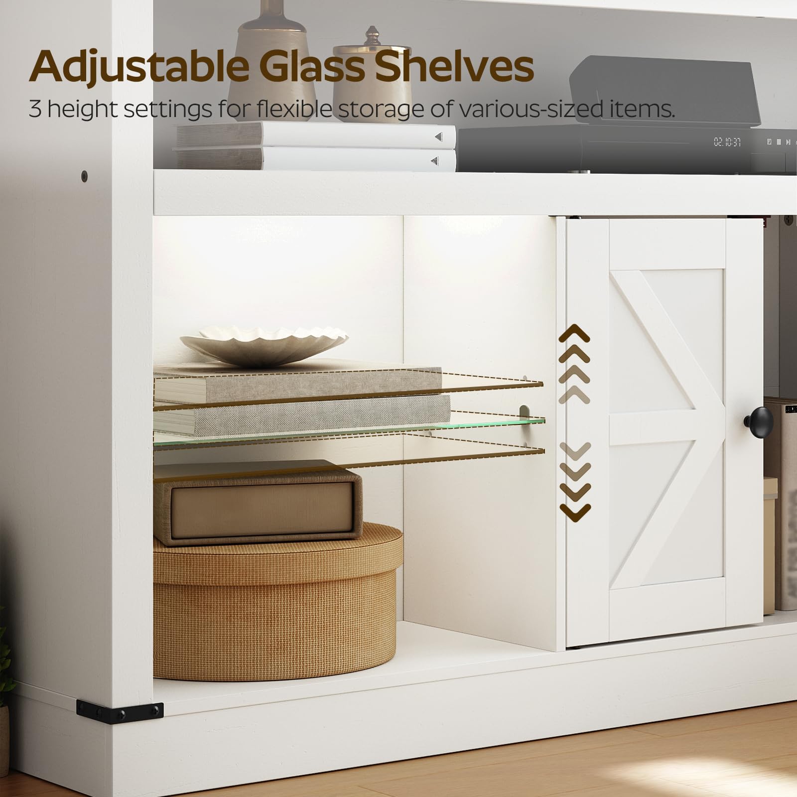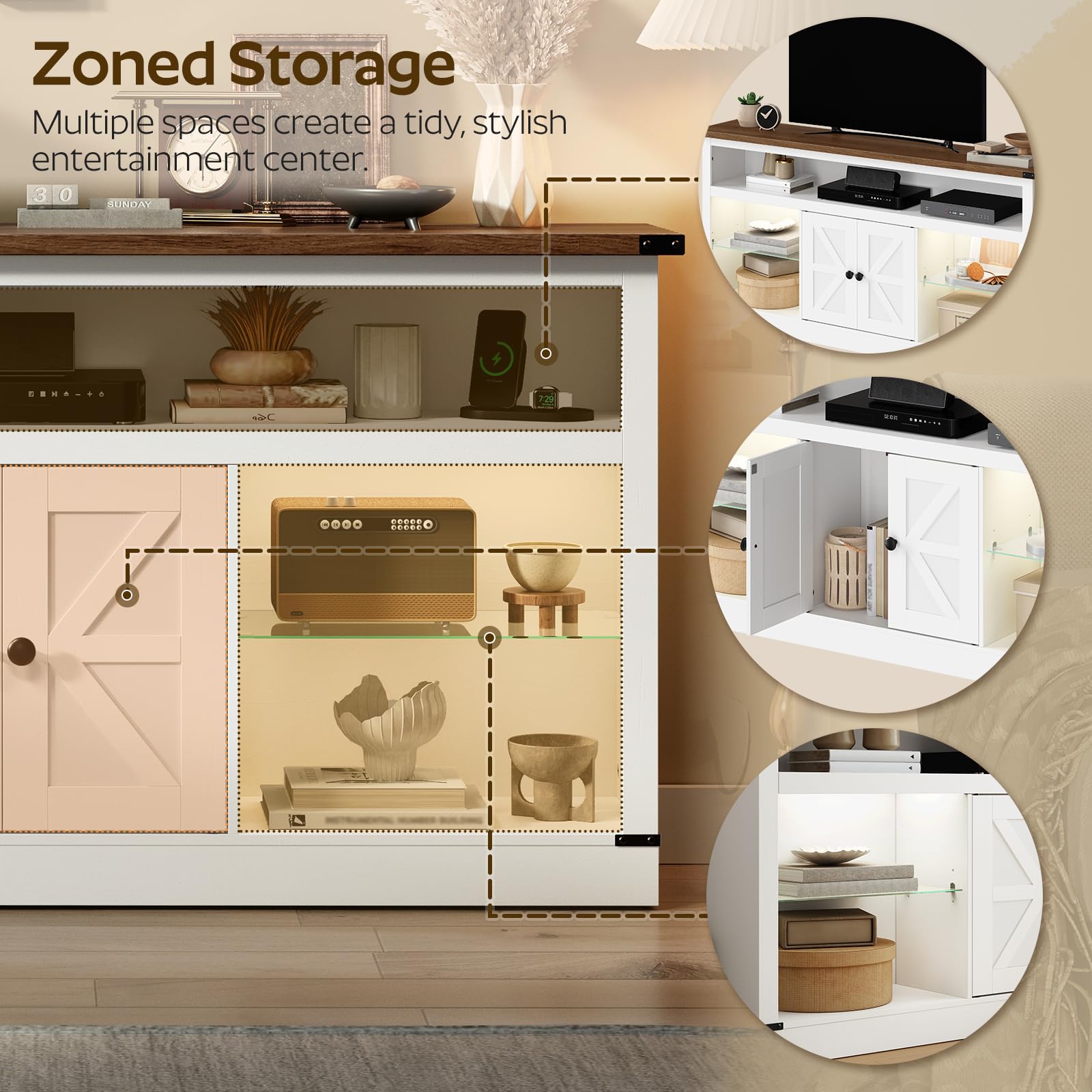YATINEY Farmhouse TV Stand for 65 Inch, Entertainment Center with Sensor LED Light, Media TV Console Table with Storage Cabinet and Glass Shelves, for Living Room, Bedroom, White and Walnut DS06WN