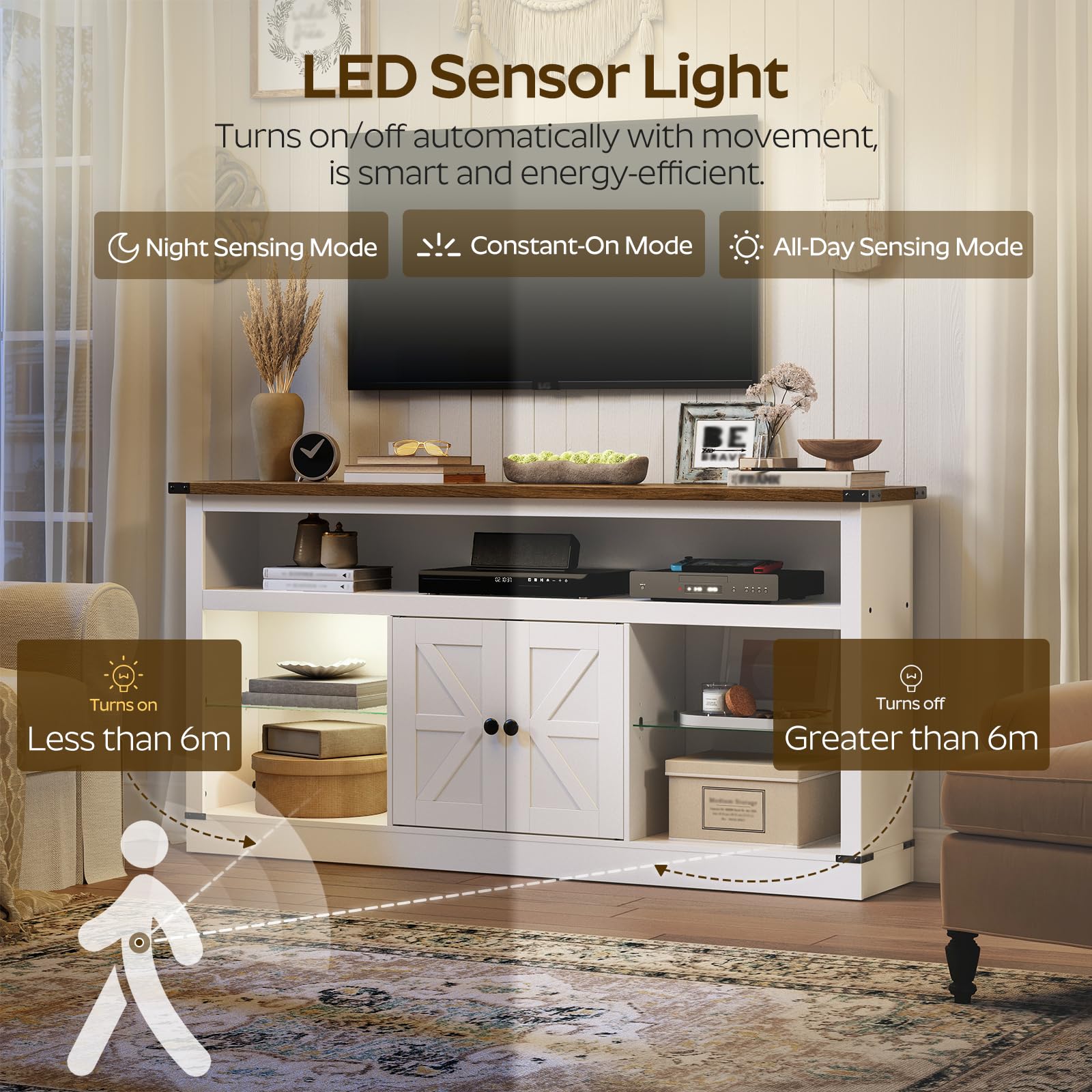 - Smart Sensor Light: The farmhouse TV stand features an adjustable sensor light with multiple modes. The light turns on automatically when someone approaches at night and off when they leave, providing efficient energy-saving lighting for your living space