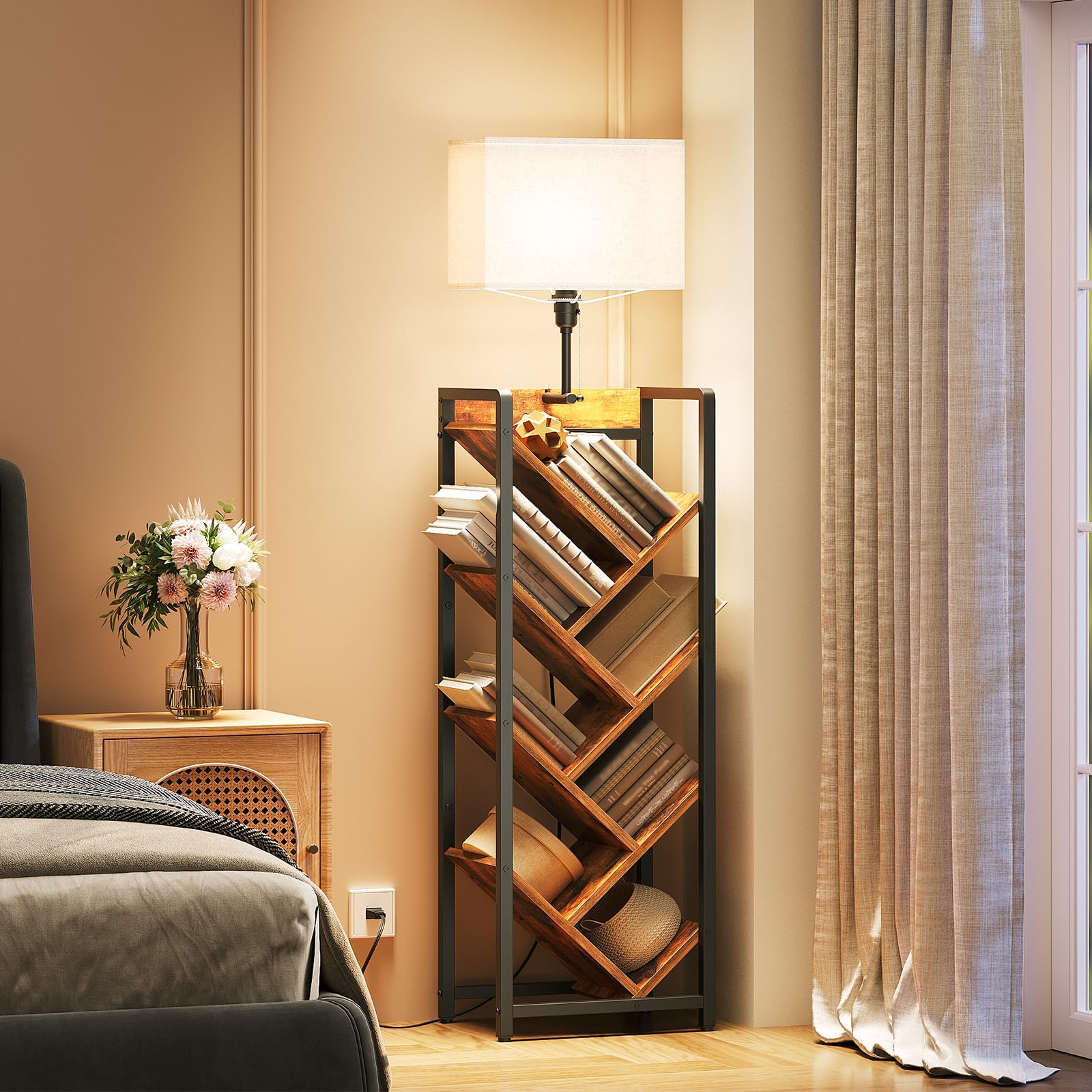 YATINEY Tree Bookshelf with Light, 6 Tier Book Shelf, Wooden Bookcase for Narrow Space, Floor Standing Tall Bookshelf, Industrial Corner Display Shelf, Rustic Brown SJ08DBR