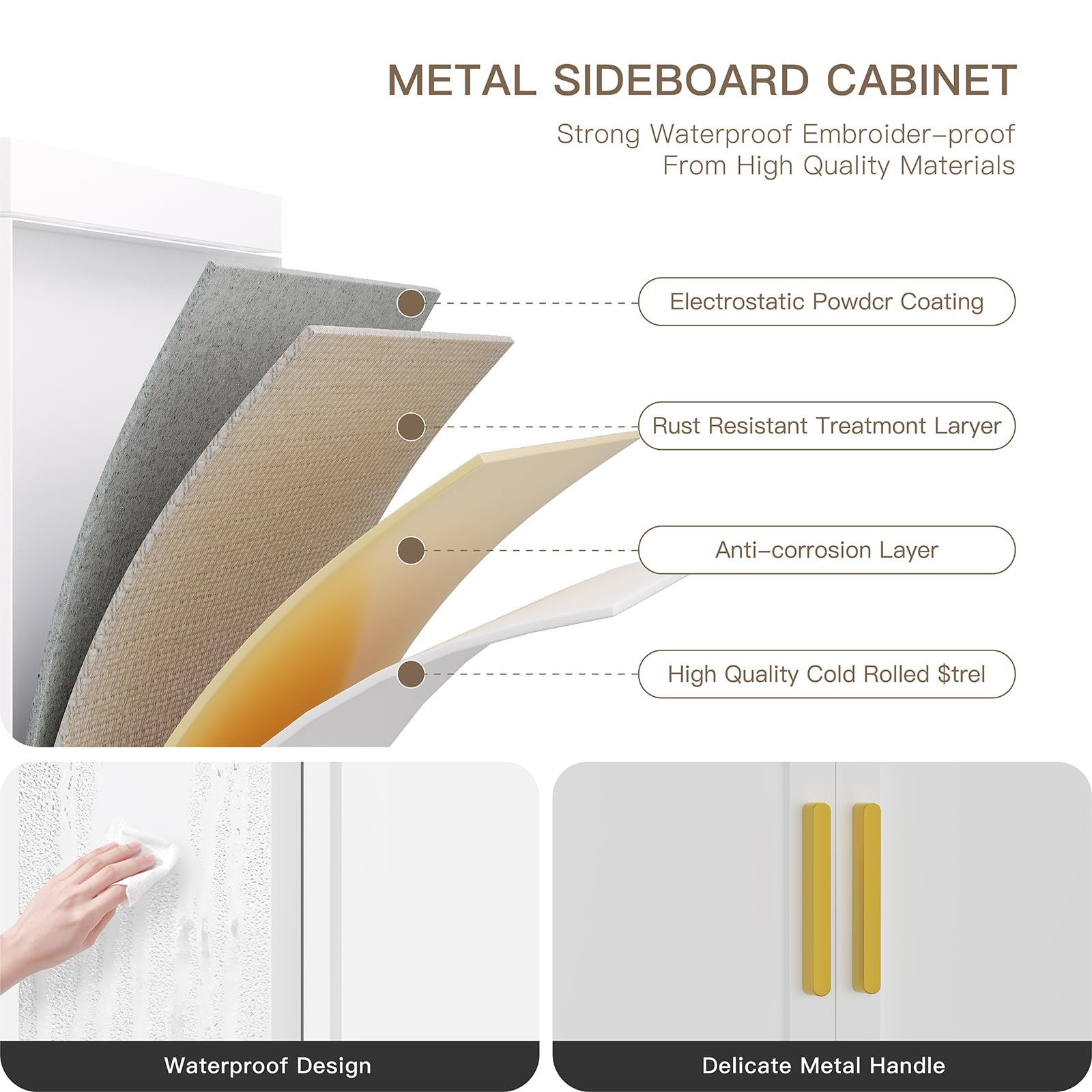 YAUWOH Metal Sideboard Cabinet with Big Drawers,Farmhouse Coffee Bar with One Adjustable Shelves,Buffet Cabinet,Metal Storage Cabient for Kitchen, Dining Room, Entryway, White