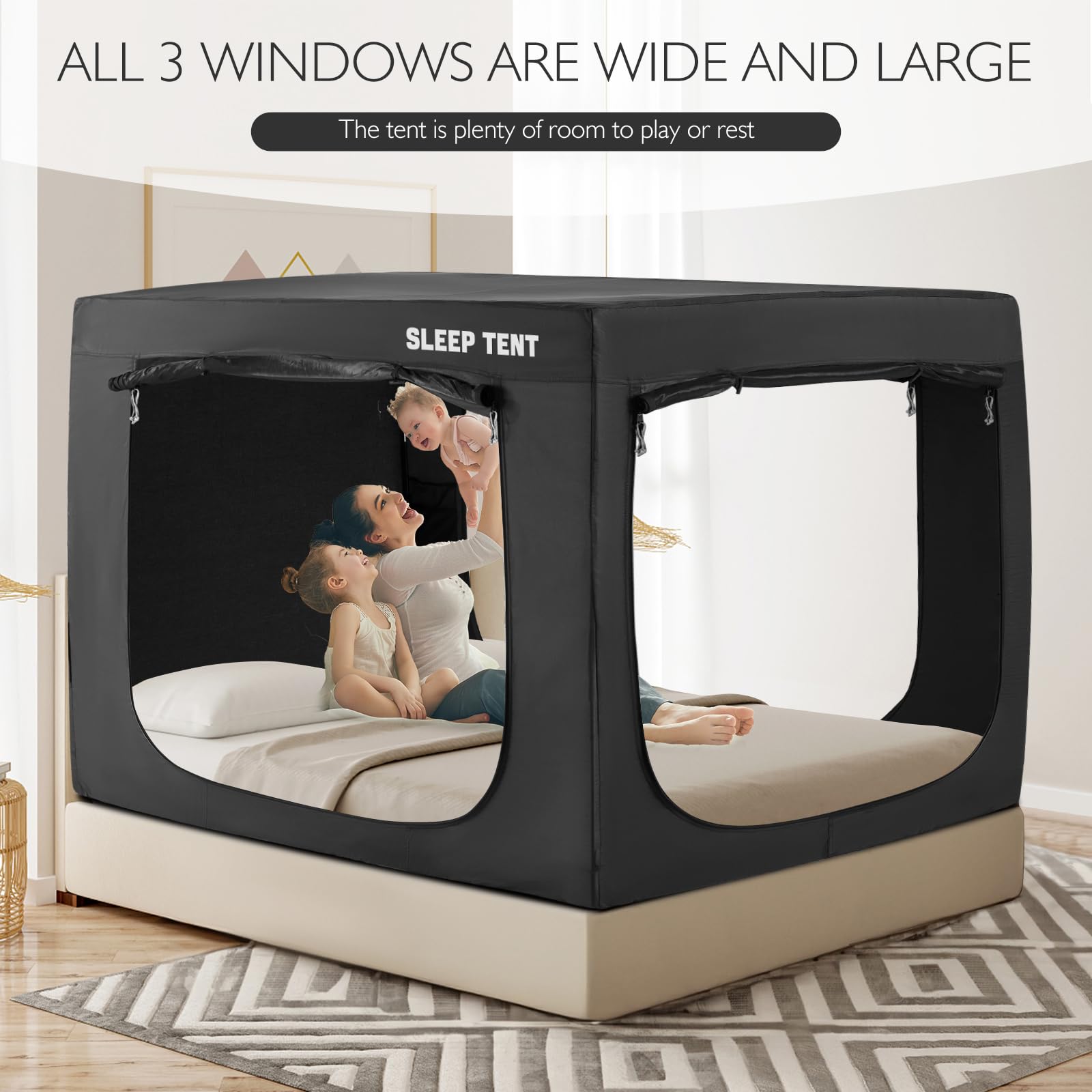 - EASY ENTRY AND EXIT - 3 DOORS: This double bed tent has three entrances, each with a separate mesh window that provides good ventilation when you're feeling stuffy. When you're cold, the mesh windows provide good ventilation; when you're hot, the mesh windows provide good ventilation. When you feel cold, all the curtains will be lowered to keep you warm. Let you enjoy a purer sleep during the day or night.