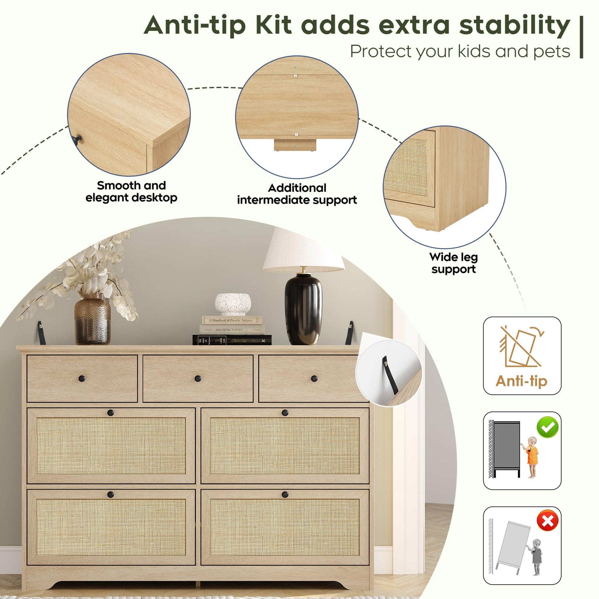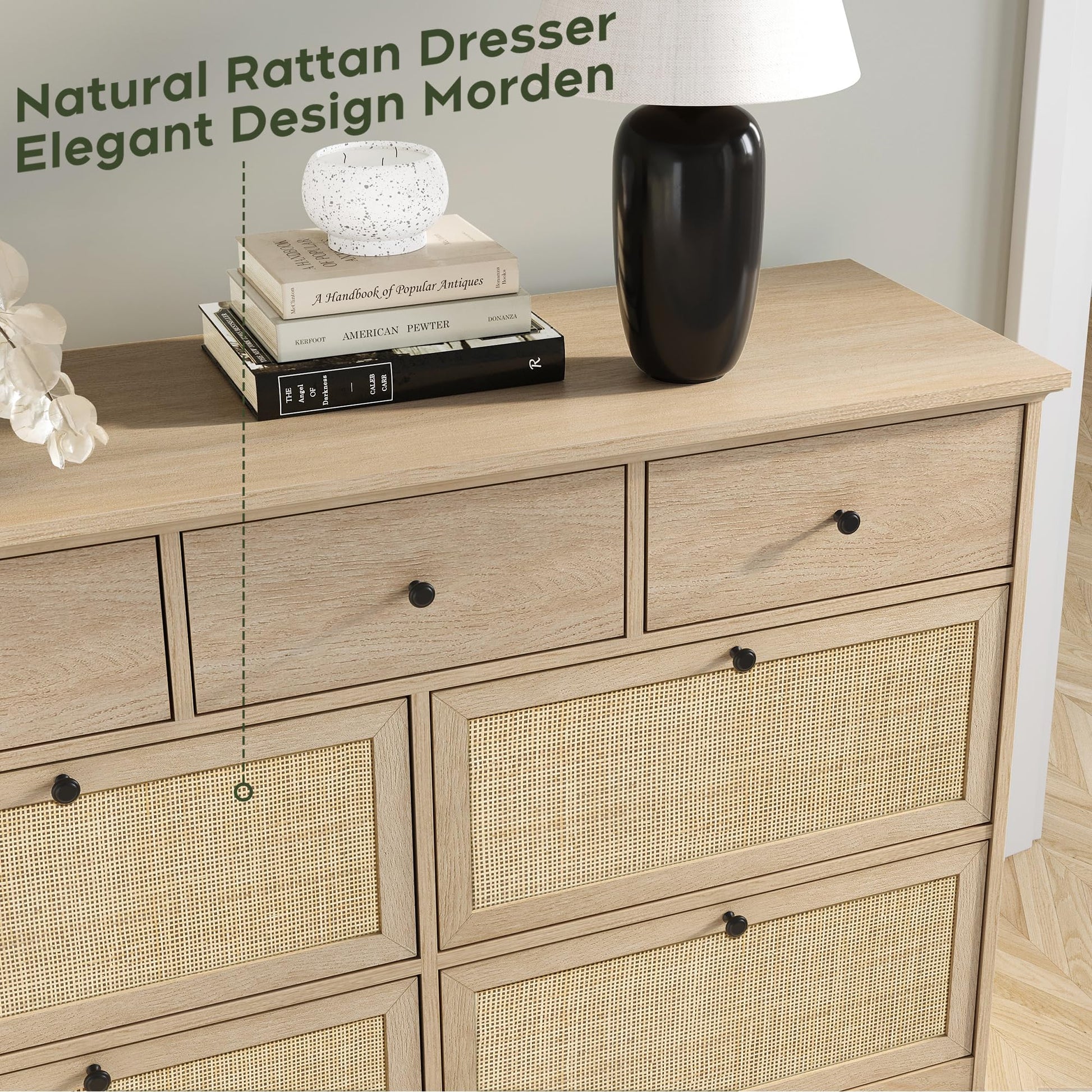 Yechen 7 Drawers Natural Rattan Dresser for Bedroom, Mid-Century Modern Natural Wood Dressers with Elegant Tabletop, Boho Chest of Drawers TV Stand with Sturdy Base for Living Room, Baby Nursery