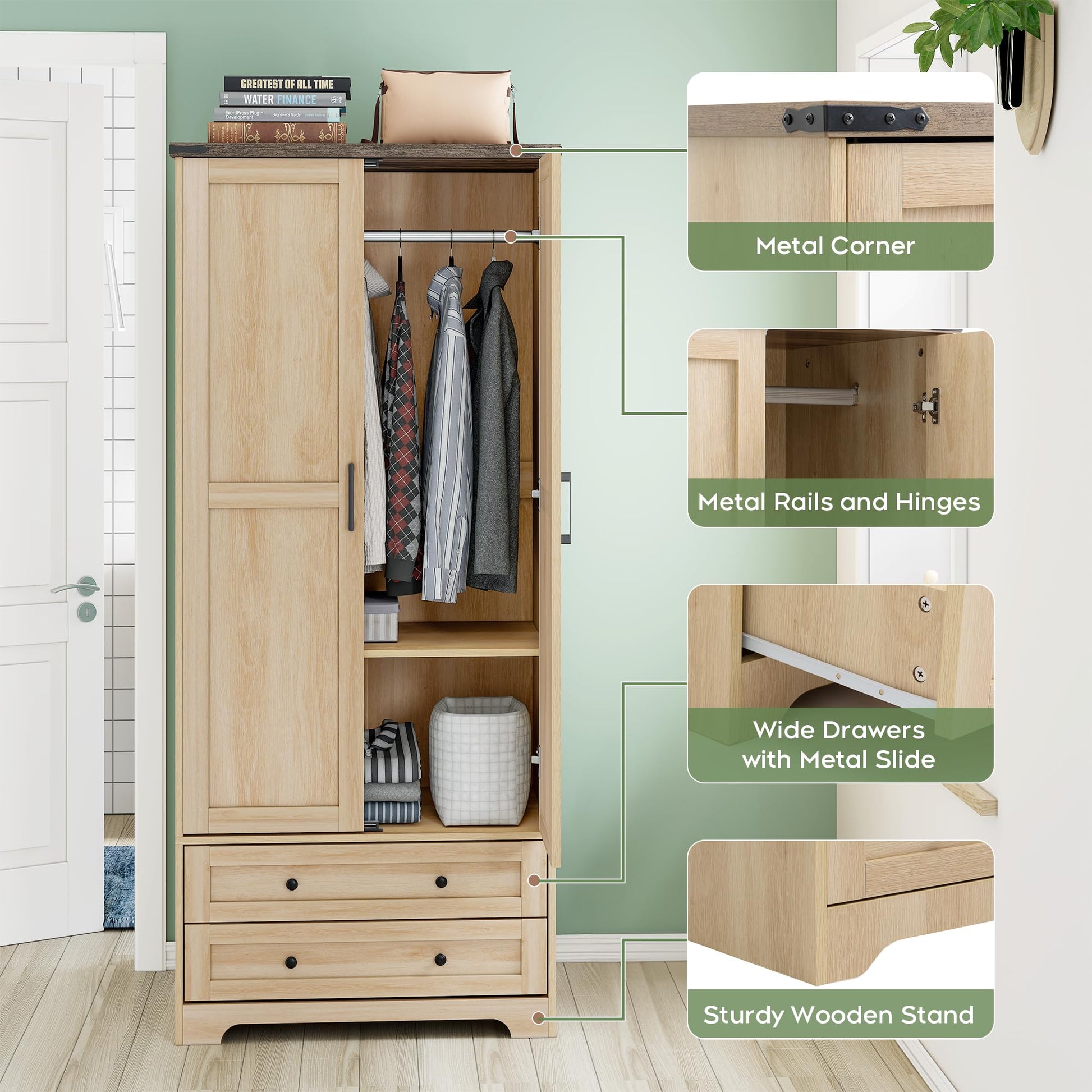 Yechen 71" Wooden Armoire Wardrobe Closet - Modern Functional Clothes Tall Storage Cabinet with Adjustable Shelf and Hanging Rail, Sturdy Freestanding Closet Wardrobe with 2 Wide Drawers (Natural)