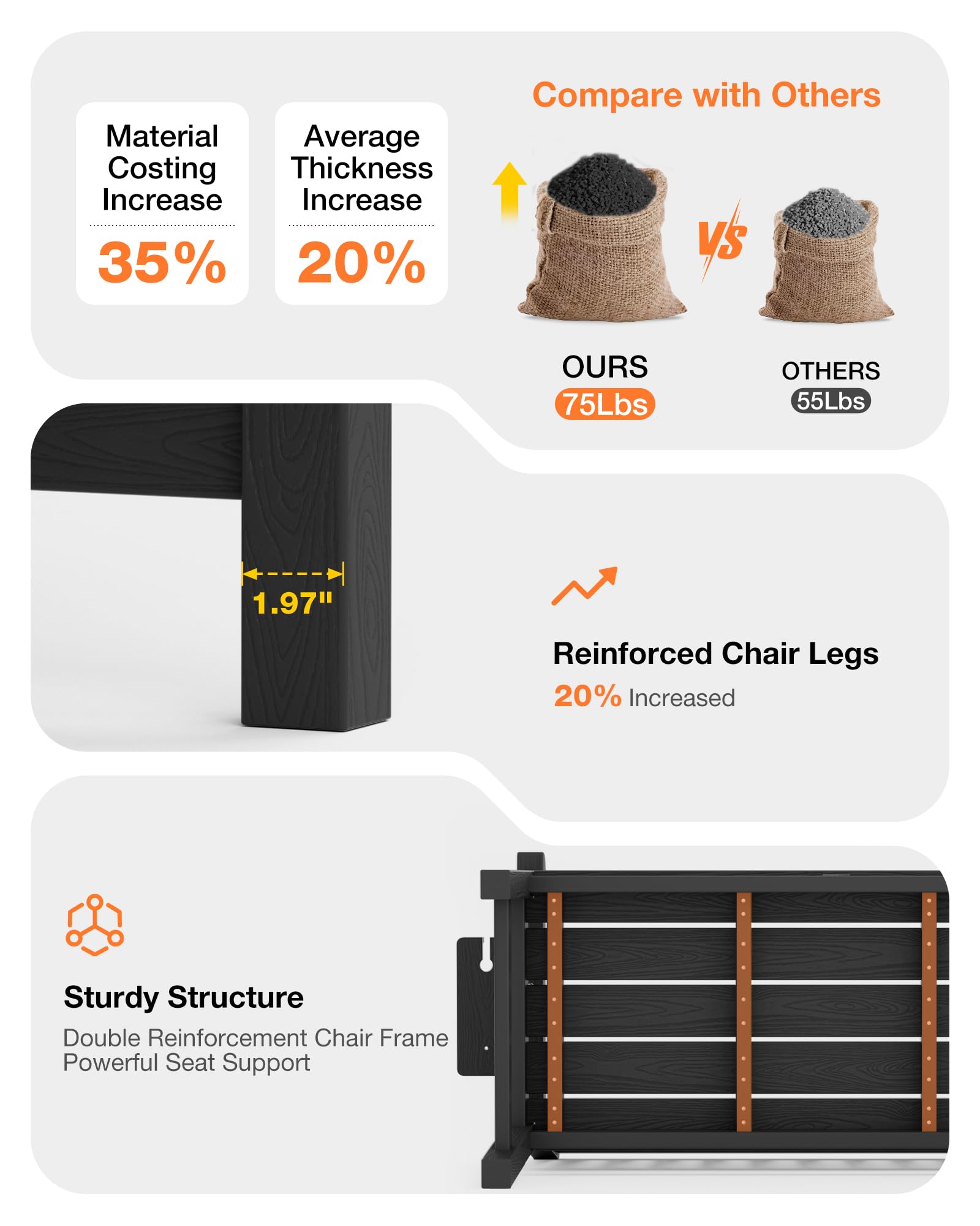 - Upgrade and Thicken Design: Compared with the other outdoor bench, our YEFU patio bench every plate is thickened by 0.2 inches, and the load capacity reaches 800 lbs. Reinforced and sturdy chair legs and double-reinforcement chair frames are more stable and won’t shake.